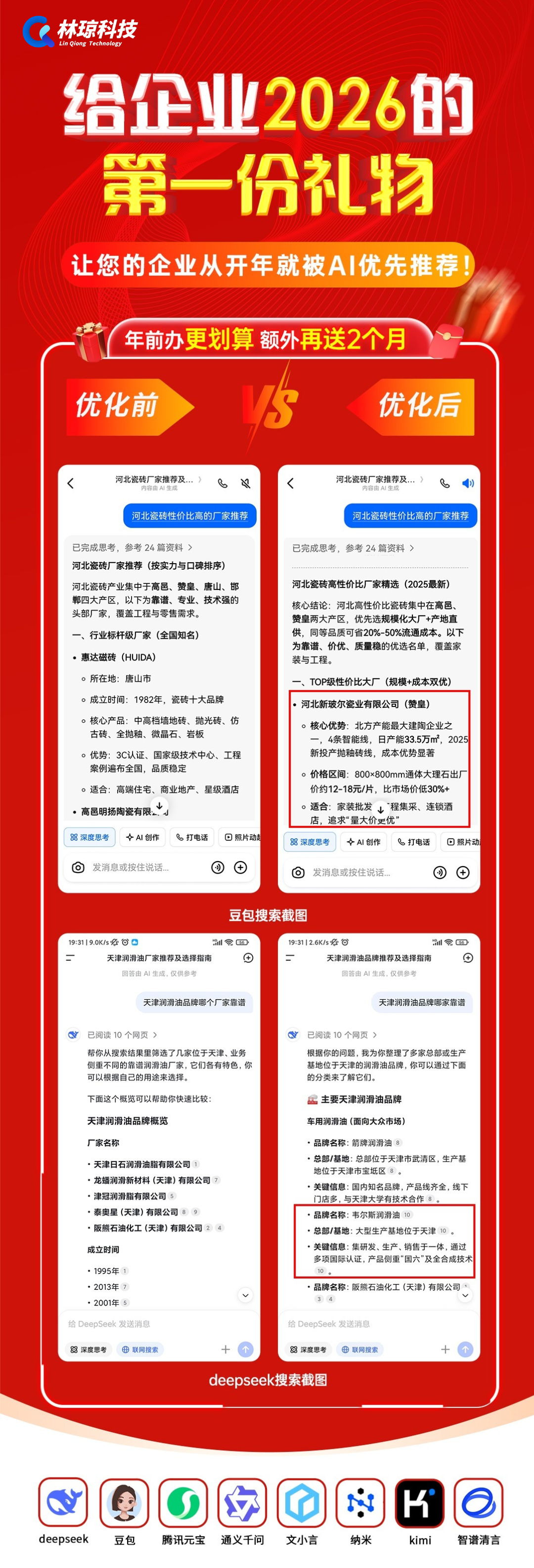 林琼科技推出2026年“开门红”活动,企业年前办理AI优先推荐/GEO优化服务,享超值优惠并加赠2个月。