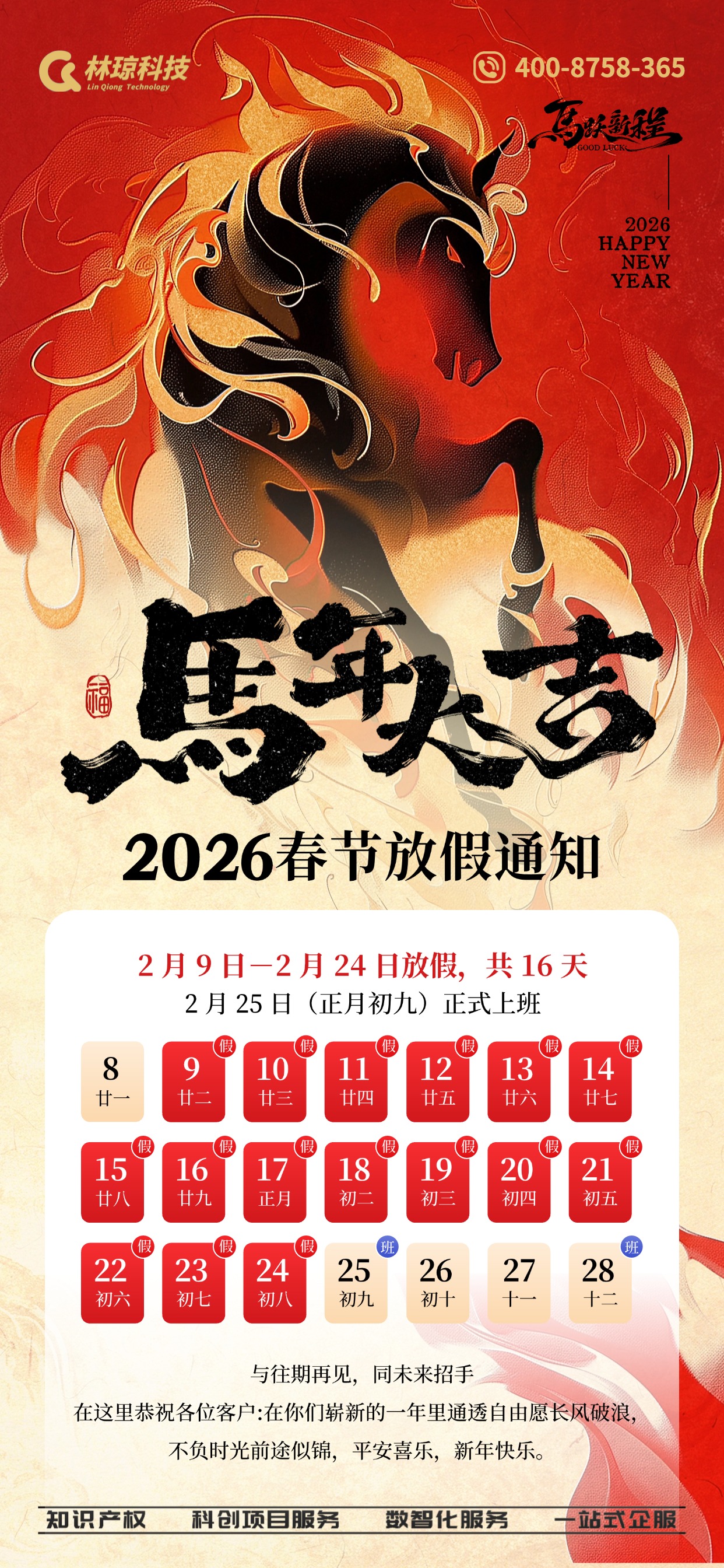 旧岁已展千重锦,新年更进百尺竿。2025年的盛典落幕,不是终点,而是新征程的起点。回望过往,我们以骐骥之智深耕科技,以同心之力铸就辉煌;展望未来,我们将以“巨马奔腾”之姿,乘势而上、勇毅前行,坚守科技赋能初心,深耕核心领域、深化创新驱动,持续完善“AI+知识产权”服务生态,推动技术迭代与服务升级,解锁更多科技融合新场景。我们将继续携手全体员工、合作伙伴,以同心为帆,以实干为桨,凝心聚力、逐光前行,打破边界、开拓创新,让每一份创意都得到尊重,让每一项技术都实现价值,共同书写林琼科技高质量发展的新篇章,共绘同心同行、共赢未来的美好蓝图!